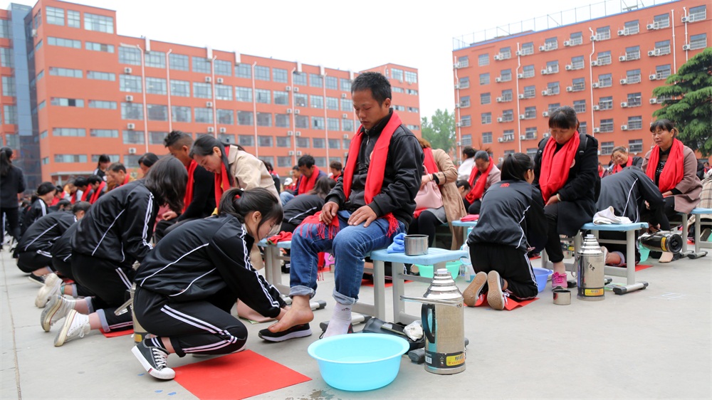 學(xué)校餐廳里,學(xué)生和家長對面而坐,學(xué)生們拿起勺子親手喂自己的父母吃飯,感受父母的養(yǎng)育之恩。啟智廣場上,數(shù)千名學(xué)生齊背《弟子規(guī)》、《孝敬父母十條》,并向父母行三跪九叩大禮,全體學(xué)生長跪并膝行至父母跟前,聆聽父母教誨。不少父母眼淚奪眶而出,抱住孩子邊叮嚀邊痛哭,而不少孩子也情不自禁地留下了眼淚。隨后,在主持人的引導(dǎo)下,學(xué)生以洗腳的方式向父母表達(dá)感恩之情。有的學(xué)生是第一次給家長洗腳,動作略顯稚嫩,家長卻都哽咽著、感動的濕了眼眶。當(dāng)學(xué)生們?yōu)楦改杆蜕细卸鞯木瞎蛽肀r,再也抑制不住感恩之情,大聲說出:“爸爸,我愛你!你太辛苦了!”、“媽媽,對不起,我不該惹你生氣。”“爸爸、媽媽,我愛你!”,一句句真摯的話語將活動現(xiàn)場的感恩氛圍推向了高潮。