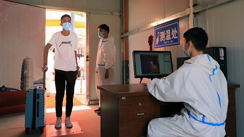 返校學(xué)生分時段、分批次在學(xué)校值勤教師、安保人員、學(xué)校醫(yī)護(hù)人員和班主任的熱心引導(dǎo)下,按1.5米間距進(jìn)行身份信息核查、健康碼核驗,在學(xué)生完成校外消毒、免水洗手消毒、人工消毒通道、行李消殺、熱成像紅外線人體測溫儀等規(guī)定流程的多層檢測后進(jìn)入順利校園,整個返校報到現(xiàn)場平穩(wěn)有序。