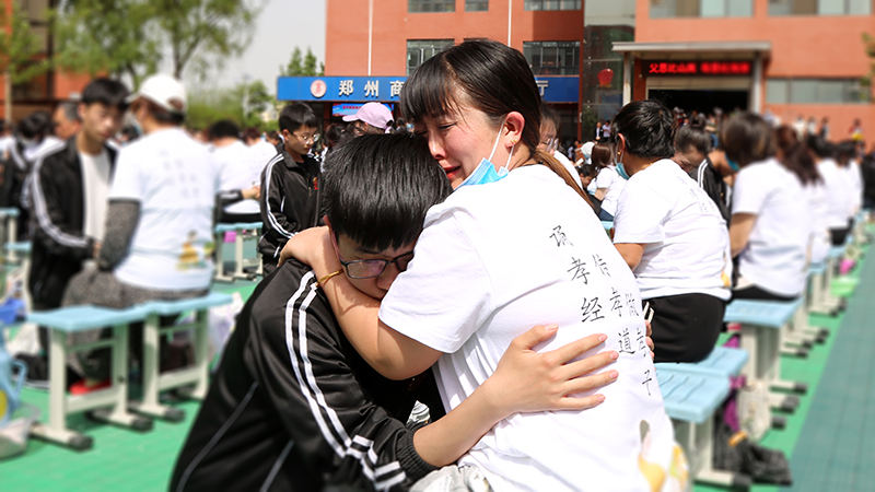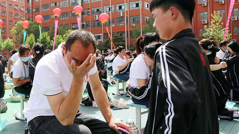 在啟智廣場上,數(shù)千名學(xué)生齊背《弟子規(guī)》、《孝敬父母十條》,向父母行三跪九叩大禮,全體學(xué)生長跪并膝行至父母跟前,聆聽父母教誨,盡情的釋放出自己的真情,帶給父母一次又一次的感動,不少父母眼淚奪眶而出,抱住孩子邊叮嚀邊痛哭,在場學(xué)生也情不自禁地流下了眼淚。